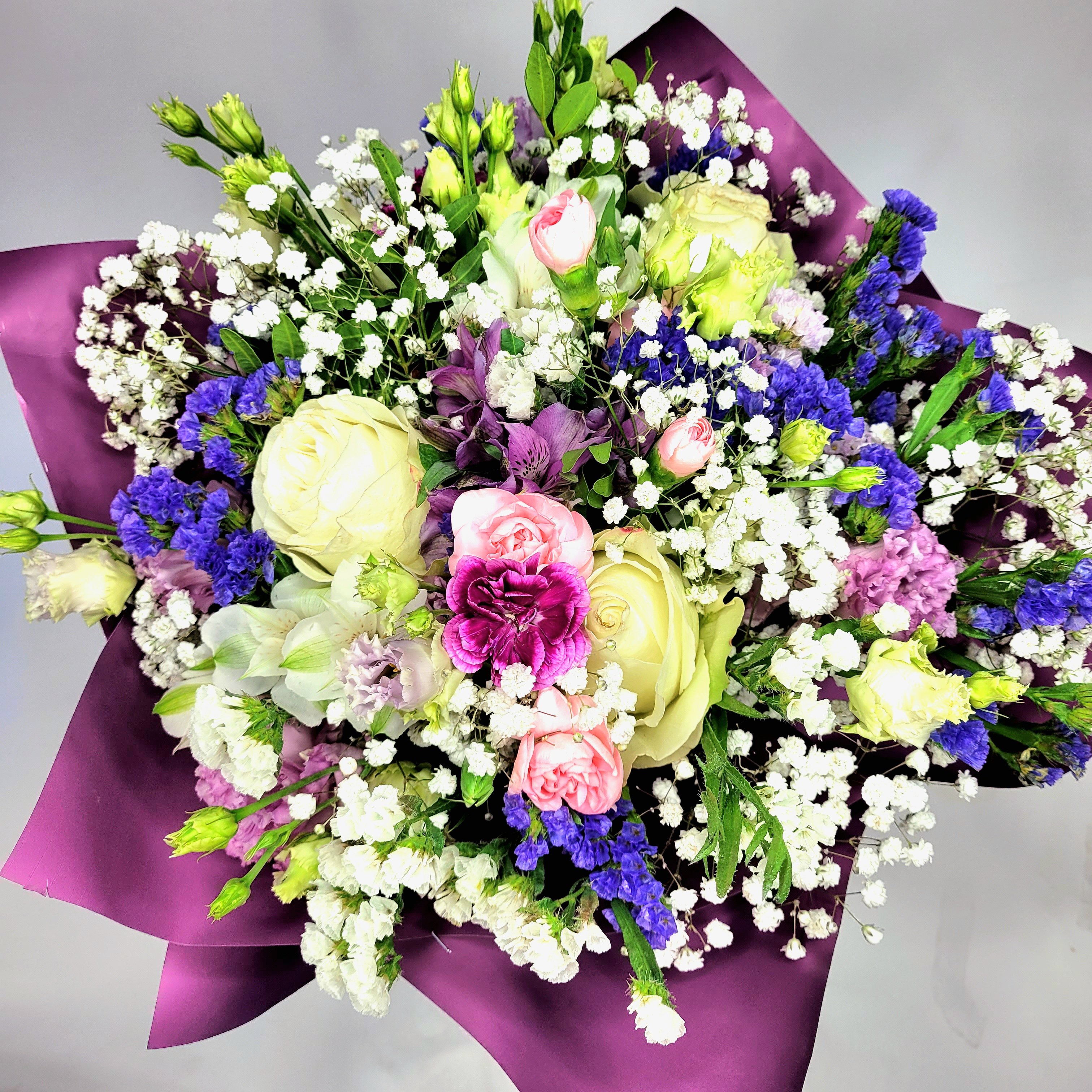 Kytice Vladimíra je tvořena z bílých růží, růžových mini karafiátů a fialkové eustomy, limonium a gypsophilou. Květy jsou doplněné dekorativní zelení a manžetou.